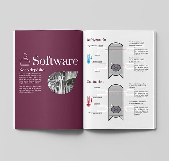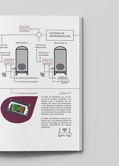 Viaconfer se trata de un sistema de control de la fermentación del vino. A través de su monotorización remota se puede controlar la temperatura y el llenado de las bodegas, generando alarmas en caso de incidencias. Para una correcta explicación Electricida Viala nos pidió un libro editorial para poder enviarlo y darlo en mano en todas las ferias a las que acuden. Este proceso es muy delicado y costoso, es por ello que una buena explicaión es crucial.